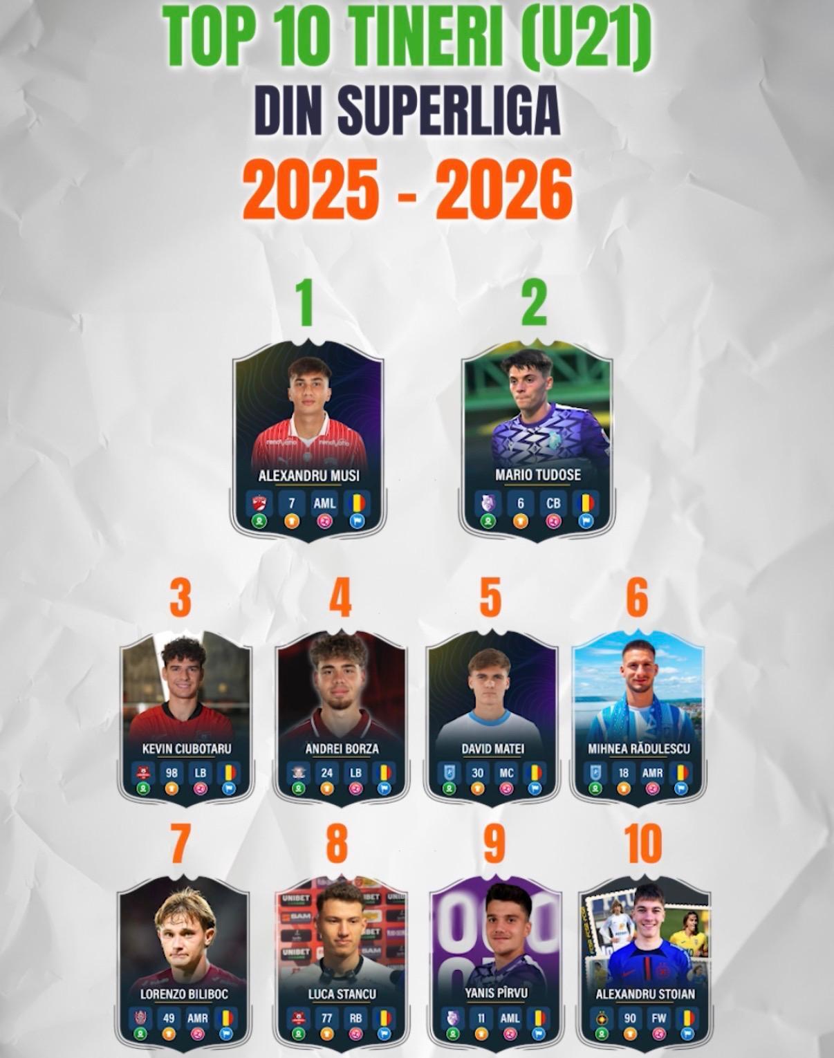 Asa arata top 10 cei mai buni jucatori under 21 din acest moment, cu fotbalisti experimentati precum Musi sau Borza, dar si cu debutanti pe prima scena, cum ar fi Biliboc, Matei sau Tudose.